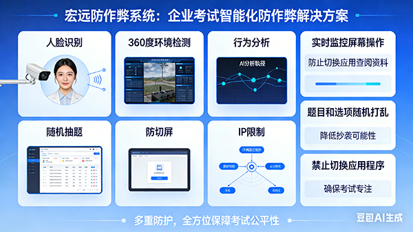 宏远防作弊系统让企业考试从传统的线下监考模式,转变为智能化、自动化的在线防作弊模式。支持人脸识别、360度环境检测、行为分析、随机抽题、防切屏、IP限制等全方位防护,多重防作弊措施,全方位保障考试公平性。